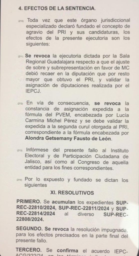 La sentencia revoca el fallo anterior de la Sala Regional Guadalajara y valida la asignación de la diputación al PRI, desestimando la constancia que inicialmente había sido otorgada al Partido Verde Ecologista de México (PVEM).