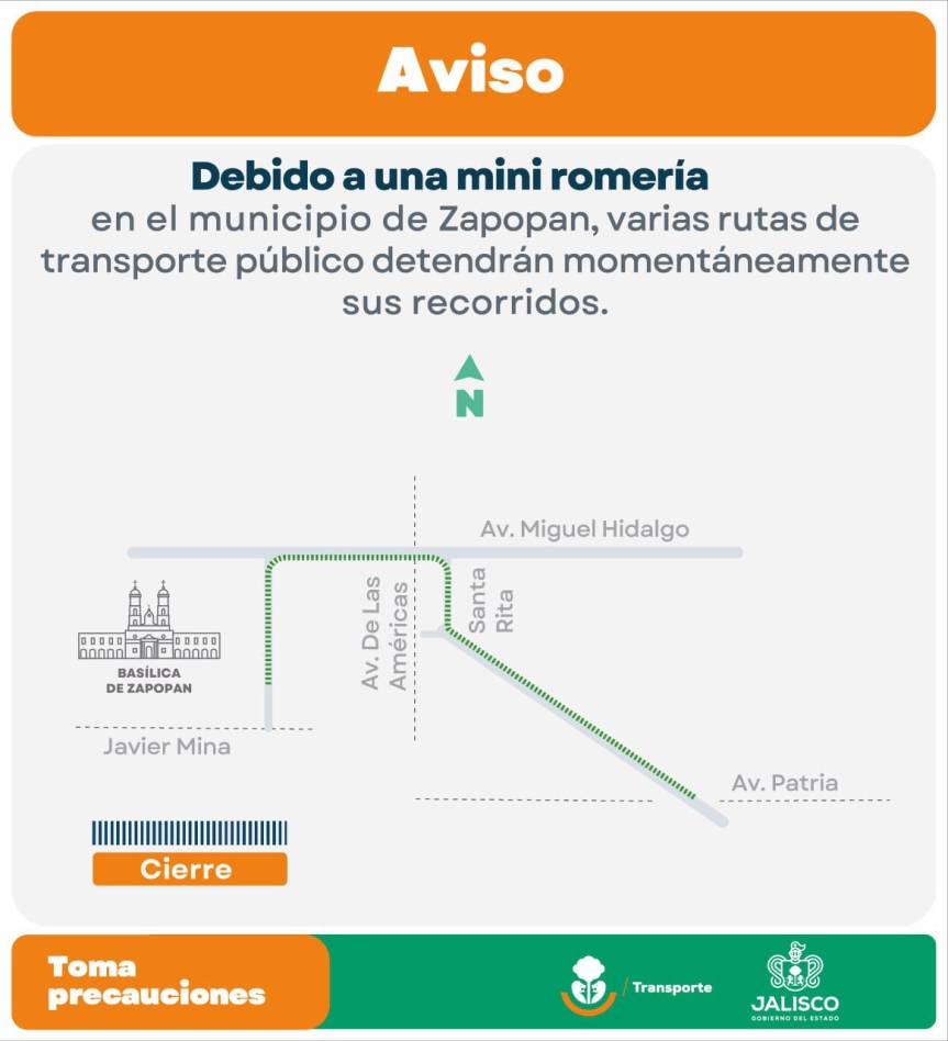 De 14:30 a 17:00 horas, una mini romería recorrerá de Plaza Patria a la Basílica de Zapopan, pasando por avenidas como Manuel Ávila Camacho, Aurelio Ortega, e Hidalgo, hasta llegar al Andador Prolongación 20 de Noviembre.
