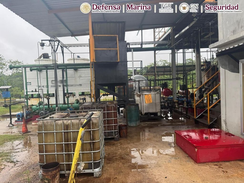 Resultado de labores de inteligencia, elementos federales, junto con personal de Pemex y la Secretaría de Energía, catearon un predio en Coatzacoalcos, Veracruz, donde operaba una refinería ilegal.
