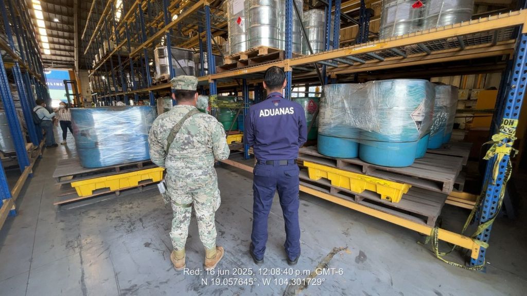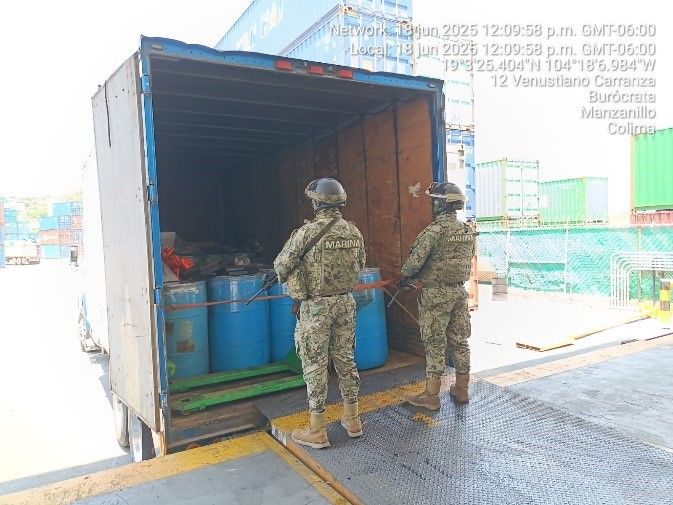 La Secretaría de Marina informó el aseguramiento de más de 6 mil 600 litros de cloruro de propionilo y 21 toneladas de ácido acético glacial en el puerto de Manzanillo, Colima.