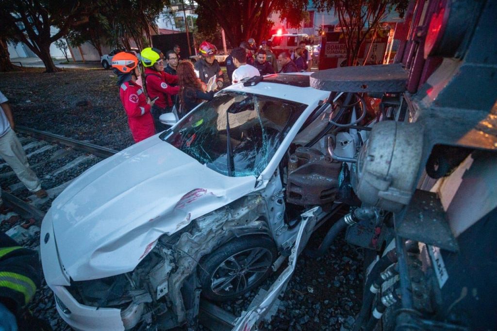 En el cruce de las avenidas Inglaterra y Arcos de Guadalajara Jalisco, se registró un choque entre un auto compacto y el tren, dejando como resultado cuatro personas heridas de forma leve.