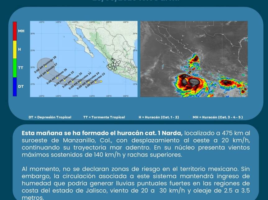El huracán Narda se intensificó a categoría 1 en la escala Saffir-Simpson y mantiene condiciones adversas en el occidente del país, informó el Servicio Meteorológico Nacional (SMN).
