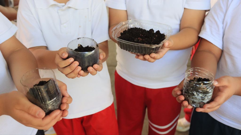 Entre las dinámicas se incluye la reutilización de envases de PET para crear flores decorativas y huertos escolares con cultivos como cebolla, pepino, jitomate y rábano.