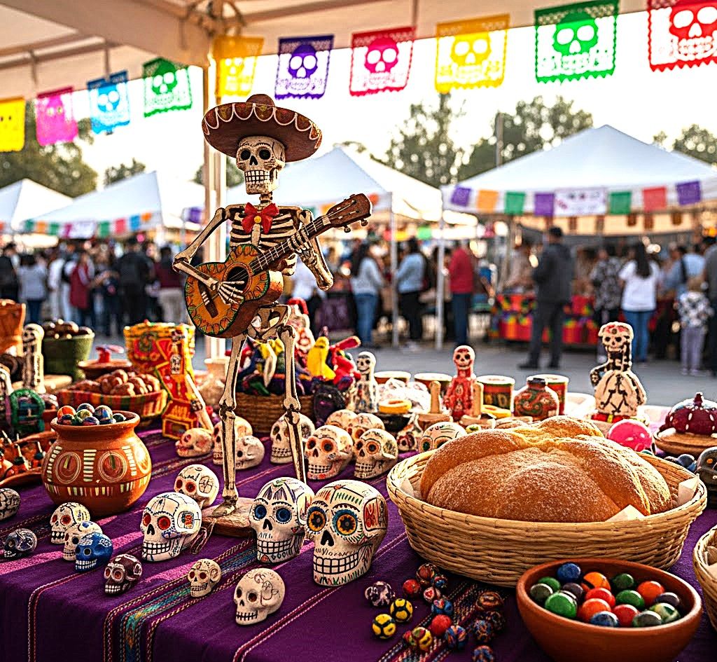 Que van desde calaveras, papel picado y Catrinas, hasta pan de muerto, juguetes de madera y flores de cempasúchil.