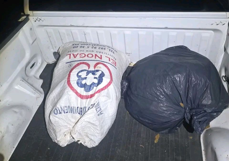 La revisión reveló que el vehículo no tenía placas y contenía dos costales y dos bolsas de plástico con marihuana, con un peso total de cerca de 100 kilos.