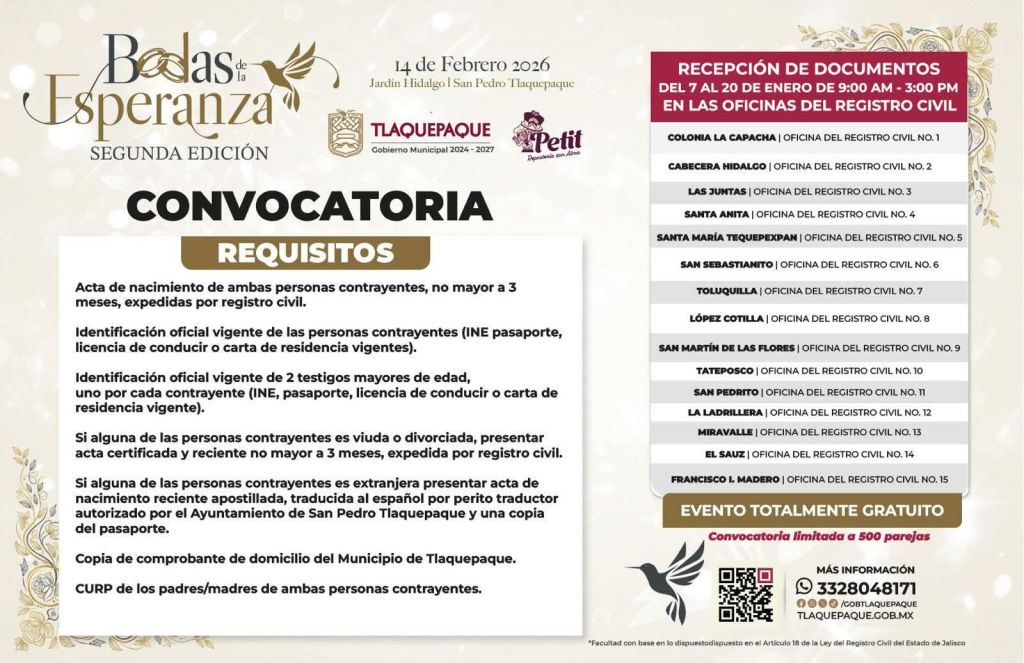 El Gobierno Municipal de San Pedro Tlaquepaque, invita a las parejas a formalizar su unión en la Segunda Edición de las Bodas de la Esperanza, un acto que «rinde homenaje al compromiso y la unión».