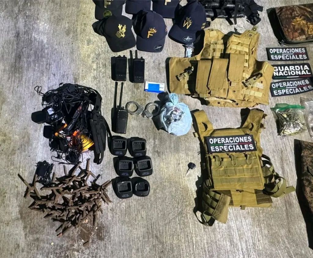 Dos equipos de radiocomunicación, cuatro chalecos tácticos, once gorras con insignias, un cuchillo, seis tablas de madera perforadas y ocho placas vehiculares.